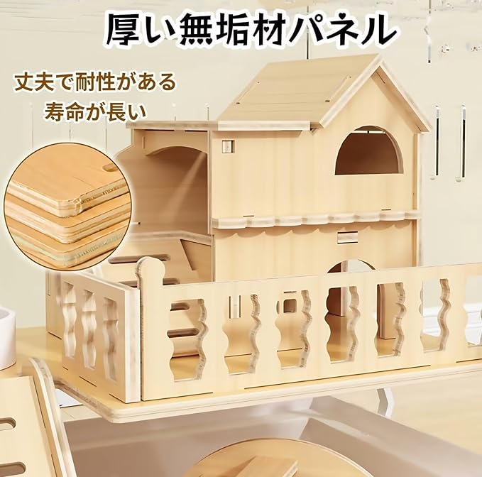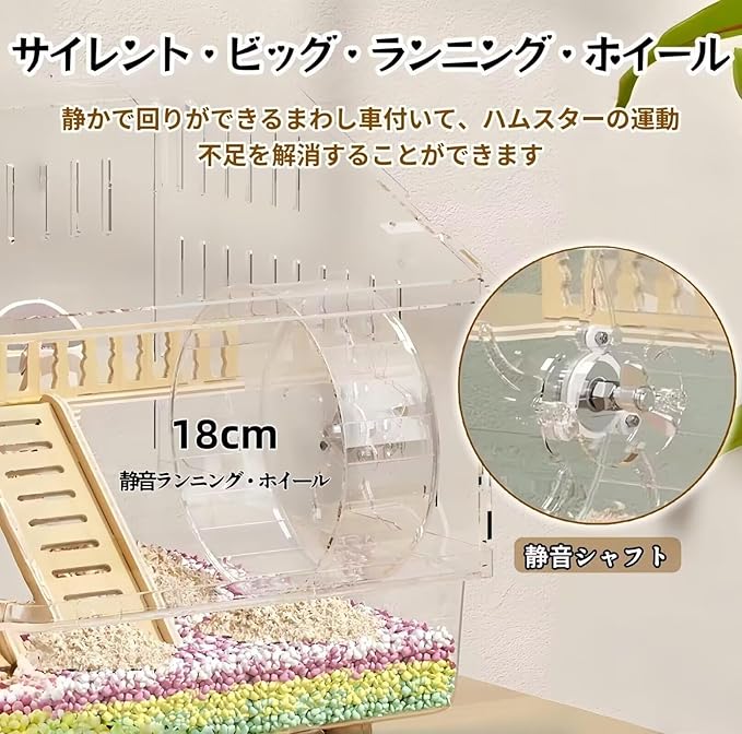 【広い空間・超豪華セット】ケージ本体、給水ボトル、餌入れ、ハウス、お風呂などで構成されています。高級ヴィラのような二階建てのデザインで、ペットが快適に過ごせるスペースを確保しています。静かで回りができるまわし車付いて、ハムスターの運動不足を解消することができます。ご注意:サイズ測定では1-3cmの誤差があります。予めご了承ください。