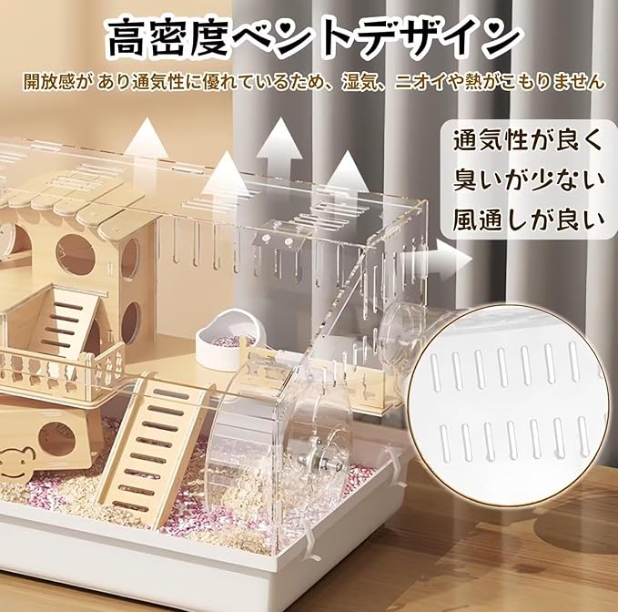 【通気性抜群】ケージの屋上と両側は通気穴がたくさん付き、通気性抜群で、風通しが良い、蒸し暑さを防ぎ、ハムスターを快適にする。開放感が あり通気性に優れているため、湿気、ニオイや熱がこもりません。
