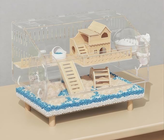 ハムスターケージ 小動物ケージ 透明 アクリル 二階建て 47x30x37.3cm 飼育ケージ 広いスペース 頑丈 軽量 通気性と快適性 持ち運び便利 掃除簡単 回し車 給水ボトル お風呂付き 組み立て簡単 日本語説明書付き(リビング・寝室用) | KAZESHOP