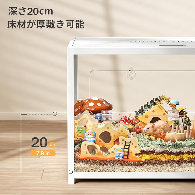 【組み立て簡単&20cm深さ】フロントドアの構造がアップグレードされ、組み立てがより簡単になりました。一人でも簡単にできます。深さ(前扉底面の高さ)は20cmで、たくさんの床材を入れても飛び散りにくくなり、ハムちゃんも思う存分掘ったり潜ったりできます。