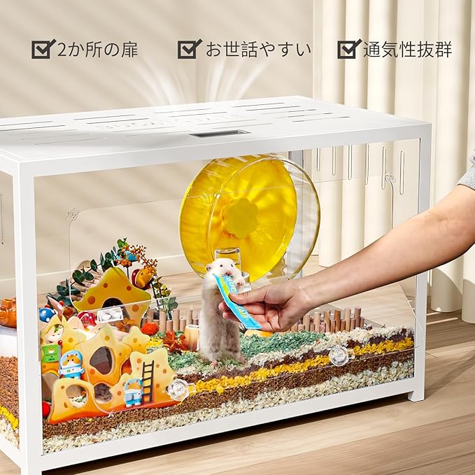 【通気性抜群&お世話やすい 】トップカバーと左右両側に排気口が設計されているので通気性抜群で、風通しが良い、夏は快適に過ごすことができます。天面と前面の2か所に扉がついていますので、日常のメンテナンスやエサやりがしやすいになります。また、床材の取り替えが簡単、お手入れ掃除も楽に行えます。