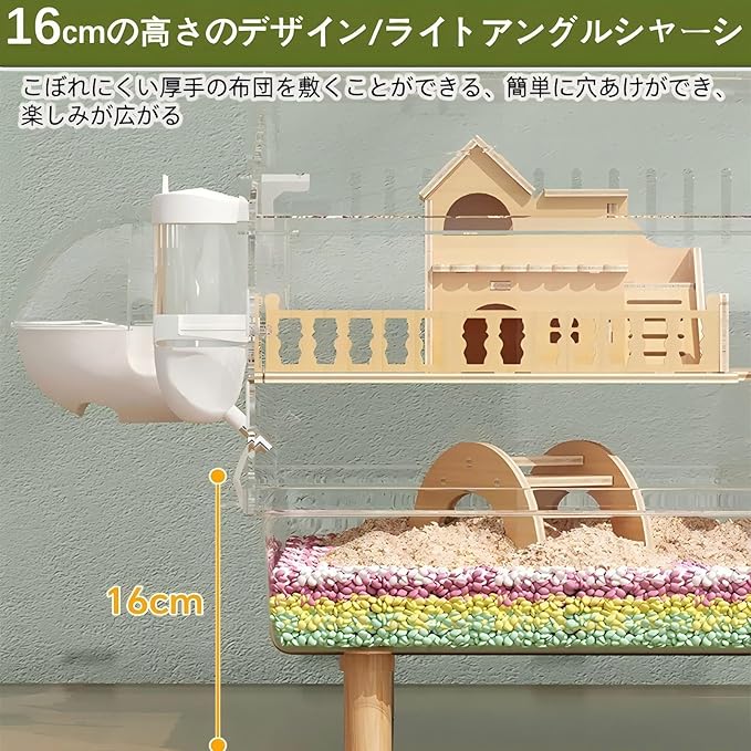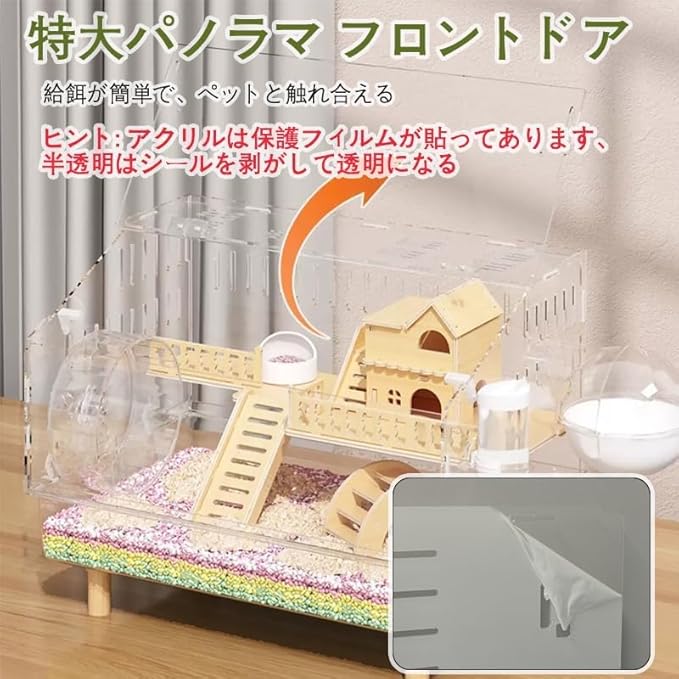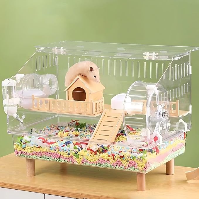 ハムスターケージ 大き透明ハムスターケージ 2階建てアクリル製飼育 ハウス 小動物 木製 広い空間 持ち運び 組立簡単 給水ボトル 回し車 お風呂 など 9点セット 長47x幅30x高37cm (パッケージ1) | KAZESHOP
