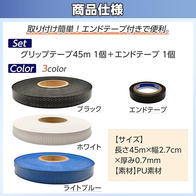【素材】ポリウレタン【長さ】45m【幅】約27mm【厚み】約0.7mm【カラー】色:ブラック、ライトブルー、ホワイト(全3色)【付属品】エンドテープ1本