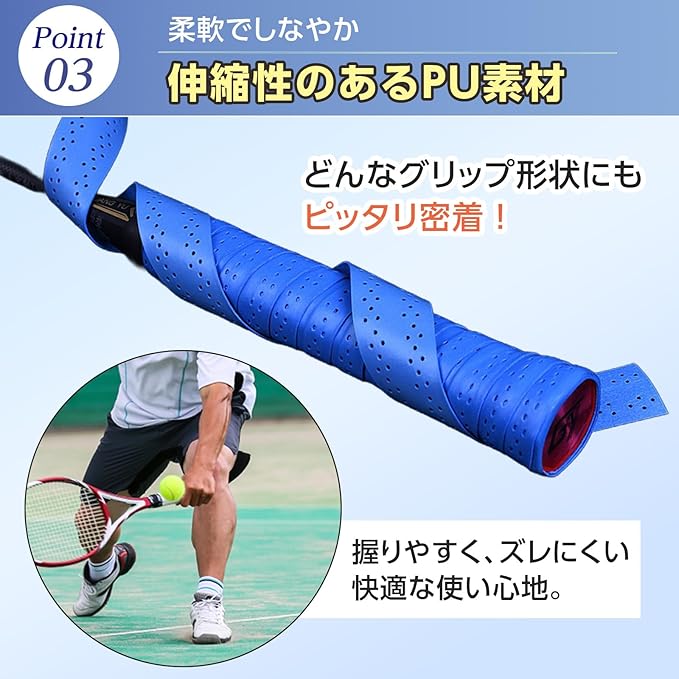 【優れたグリップ力と滑り止め性能】表面に微細な凹凸加工を施し、汗をかいても滑りにくい高グリップ仕様。テニスやバドミントンなどのラケット競技はもちろん、ゴルフクラブ・野球バット・自転車ハンドル・釣り竿など多用途に対応。握りやすく、パフォーマンスをサポートします。ポリウレタン(PU)素材を採用し、防水性と吸汗性を両立。雨天時や汗の多い環境でもしっかり握れる安定感。ベタつかず、長時間のプレーでも快適な使用感をキープ。湿気による劣化を防ぎ、耐久性にも優れています。