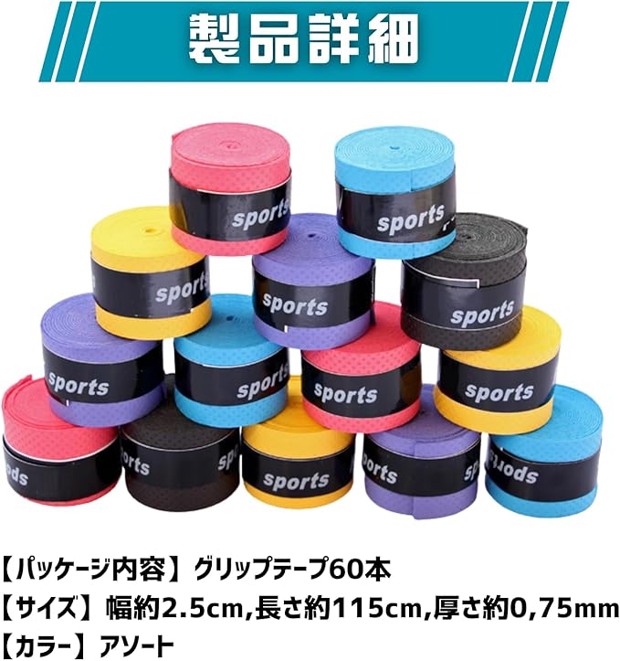 パッケージ内容:グリップテープ60本。テープの幅は約2.5cm、長さは約115cm、厚さ約0.75mm。カラーはアソートです。