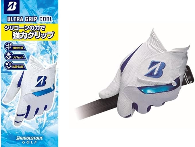 ●シリコーンプリント加工 手のひら部分には合成皮革にシリコーンプリントを施し強いグリップ力を追求。(ゴルフルール適合) ●冷感素材『SUPER COOL』採用 水分が蒸発する際の気化熱を利用した冷感素材SUPER COOLを甲側に使用し、冷たさを持続。さらに糸自体に、冷感結晶体が練りこまれているため接触冷感機能もプラス。 《 抗菌・防臭、UVカット(紫外線遮蔽率約99.3%*) 》 *株式会社ナストーコーポレーション調べ ●パンチング合成皮革使用 パンチング合成皮革を採用することで通気性を確保しムレを軽減