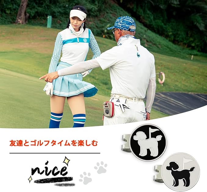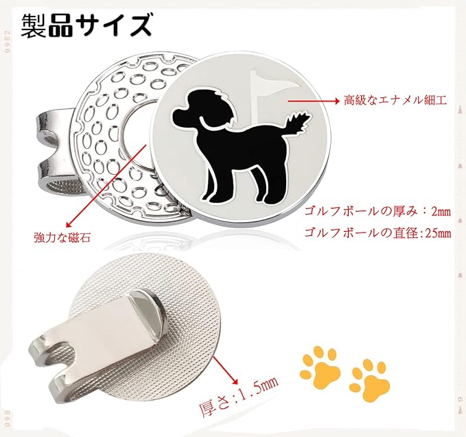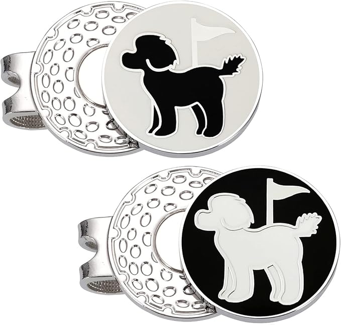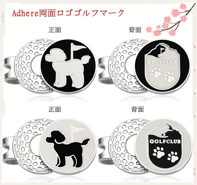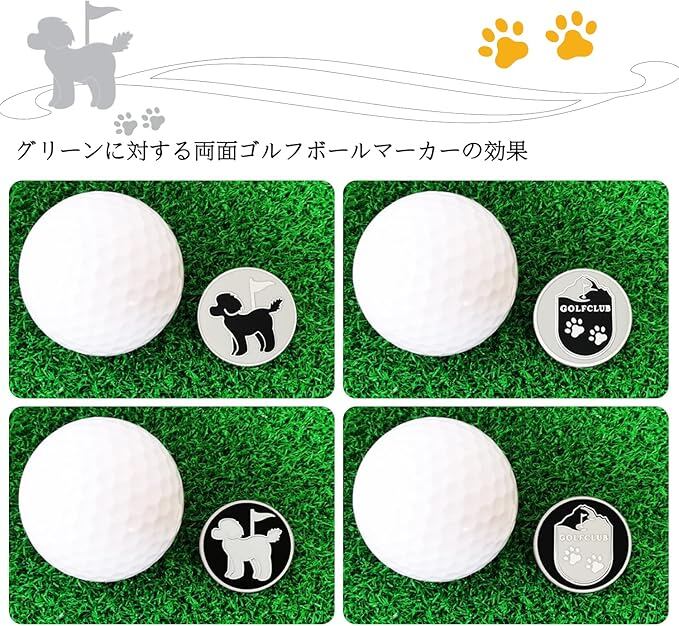 【独自の両面パターンボールマーカー】ユニークなデザインの両面ロゴです,高級エナメル技術,製品グレードが非常に高い,ボールマークフロントかわいいプードル,背面はゴルフクラブパターン。