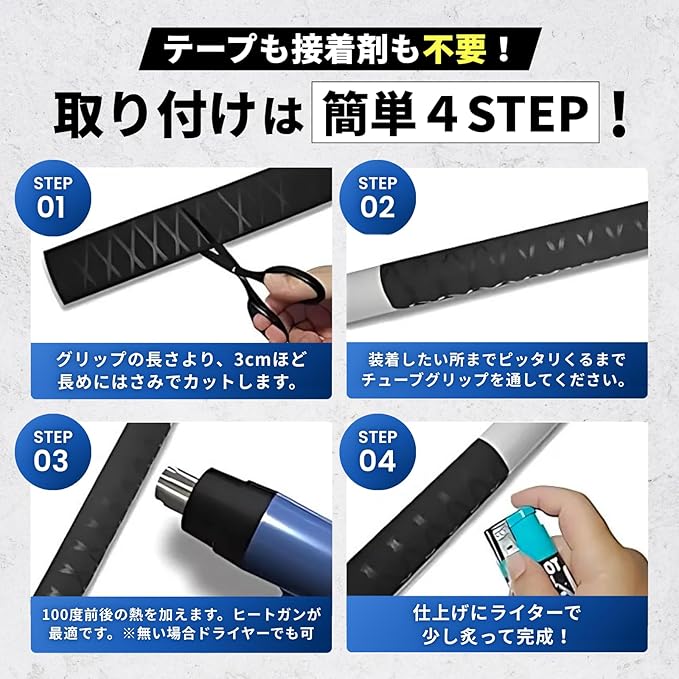 ロッドのグリップ性を高める滑り止めとして:チューブ状で簡単にカスタムが出来ます。必要な長さにカットし、装着したい場所にはめたらヒートガンやコンロなどで温めます。ぴったり貼りつくまで熱を加えます
