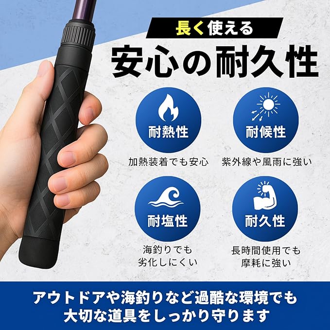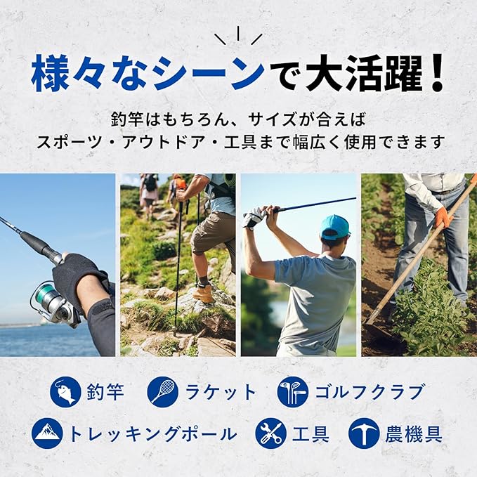 耐久性、耐候性、耐熱性、耐塩性があるので釣りロッドを以外にも、テニスなどのラケット、ゴルフグラブ、トレッキングポール、大工道具、農機具などの滑り止めに幅広く使用できます。
