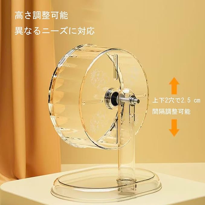 ハムスターをはじめとする小動物の健康な生活には、十分な運動が欠かせません。このハムスターホイールは、そんなペットの本能的な運動欲求を安全に、かつ快適に満たすための工夫が詰まっています。直径21cmの大型設計により、体の大きな金絲熊も小さなジュネシアも、それぞれが自然な体勢で思いきり走り回ることが可能。狭い跑輪で背骨を曲げて走る不自然な姿勢は、ペットの身体に負担をかけることがあります。本品の広いスペースは、そんな心配を取り除きます。最大の特長は、その抜群の安全性と静粛性です。走行面には細かな凹凸加工を施すことで、ペットの足が走行中に滑るリスクを低減。また、中心部には静音性に優れたベアリングを採用し、夜間の賑やかな運動時間でも、騒音が気になりにくい環境を実現しました。透明でシンプルなスタンドデザインは、どんなケージやお部屋の雰囲気にもマッチし、視覚的な圧迫感を与えません。スタンドの高さは調節可能なため、さまざまな環境にフレキシブルに対応。ペットの運動習慣をしっかりと支える、頼もしい相棒となるでしょう。