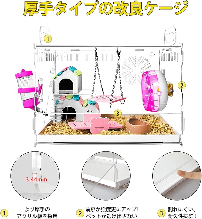 【厚手タイプの改良ケージ】四代目のハムスターケージはより厚手(3.44mm)のアクリル板を採用。ペットが逃げ出さないように、前扉が強度更にアップしました。従来のケージより割れにくく、耐久性抜群。サイズ(35*25*25cm)2段まで積み重ね可能。