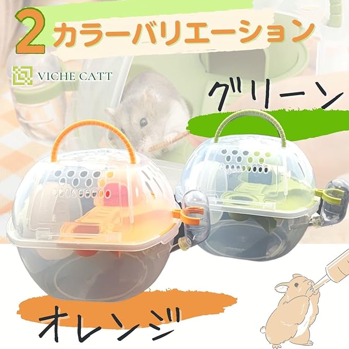 コンパクトなのに多機能なハムスターキャリー。 滑り台、給水ボトル、フードボウル、回し車、小屋がついて、一時的な外出や旅行などのお出掛けにぴったりなアイテムです。 ハムスターも快適にストレスフリーで過ごせますよ。 組み立て式で分解でき、お手入れも隅々まで清潔に保つことができます。 オレンジ、グリーンのどちらも可愛い2カラーバリエーション。 これひとつで、あなたのかわいいハムスターといつでも一緒にお出かけが楽しめます!
