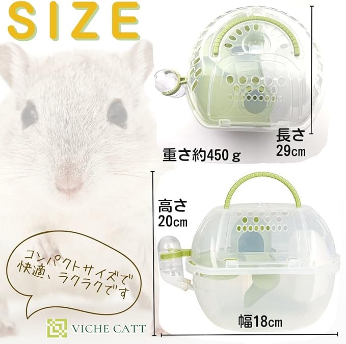 餌やお水も入れたまま運べるのでお出かけにも安心です。 そのため、ハムスターだけでなく、リスなどの小動物用キャリーとしても、もちろんご使用いただけます。 サイズは持ち運びにうれしいコンパクトサイズで、重さも約420グラムと、比較的軽量に仕上がっています。 飼育は通常のゲージ等で行っていただき、移動用として最適な設計となっているので、長時間の使用は避けていただき、ペットのためにも適切にご利用ください。