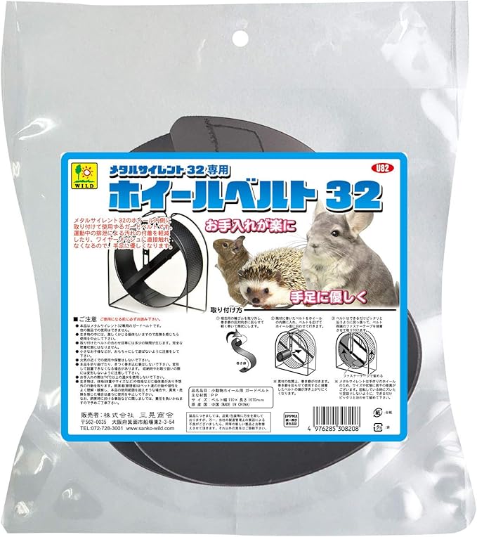 ホイール内側に取り付け使用するガードベルトです。ホイール運動中の排泄によるホイール本体の汚れの付着を軽減します。手足がワイヤーメッシュに直接触れずにホイールを回せるので怪我の予防になります。ベルトは本体の端と橋を面のファスナーで留めるだけで接続可能で、外して丸洗いできます。