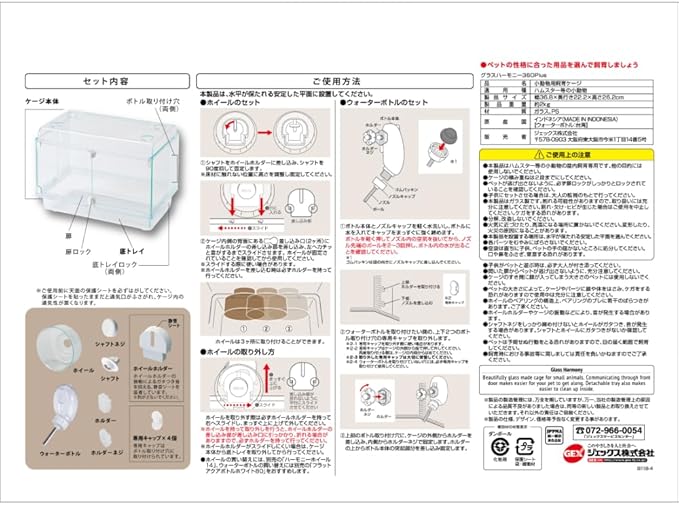 ケージ:ガラス、PS、PP、ABS ホイール:PS、SUJ ホイールホルダー:ABS ウォーターボトル:PVC、PS、ステンレス、PP、PE
