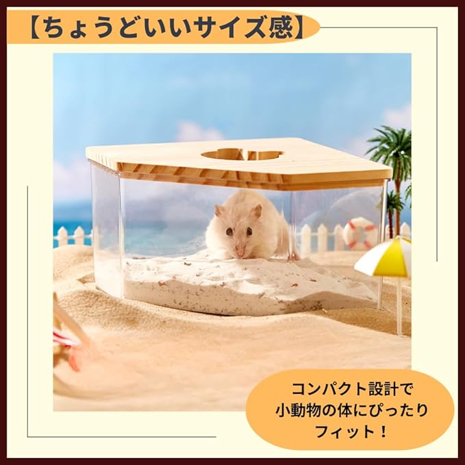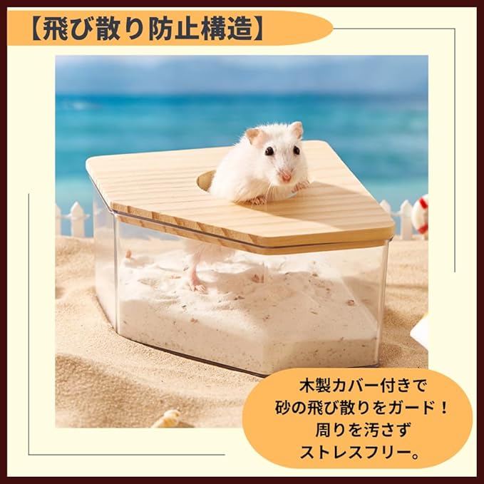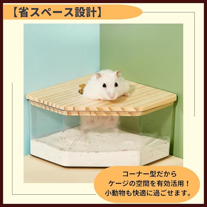 【省スペース設計】コーナー型だからケージの空間を有効活用!小動物も快適に過ごせます。【飛び散り防止構造】木製カバー付きで砂の飛び散りをガード!周りを汚さずストレスフリー。【清潔を保ちやすい】透明だから汚れがすぐ見える!丸洗いOKでお掃除もラクラク清潔キープ。【ちょうどいいサイズ感】コンパクト設計で小動物の体にぴったりフィット!
