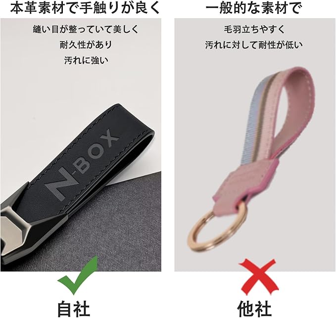 【上質の本革】エヌボックス全シリーズキーリングは、厳選した最上質の牛革を使用して作られています。縫い目が整い、シンプルでファッショナブルな美しいデザインが特徴です。質感が優れ、耐傷付性・耐摩耗性にも優れています。