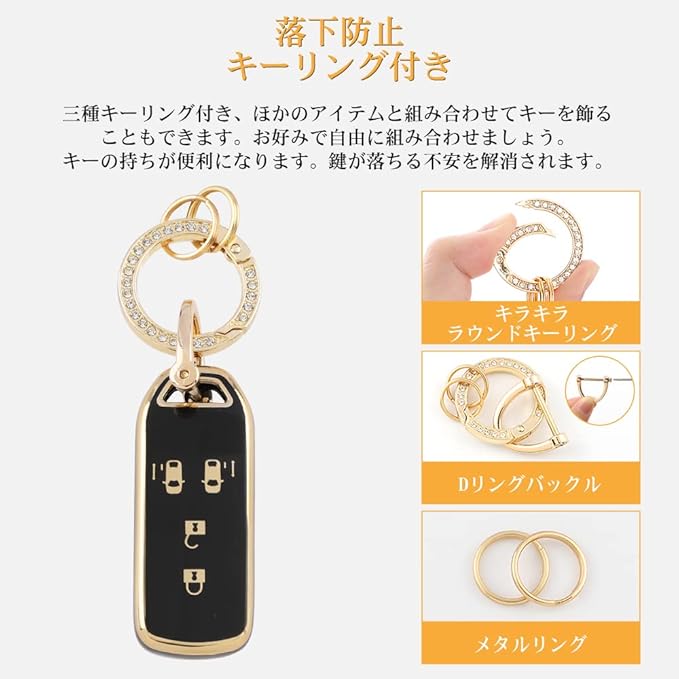 三種キーリング付き、ほかのアイテムと組み合わせてキーを飾ることもできます。キーの持ちが便利になります。鍵が落ちる不安を解消されます。お好みで自由に組み合わせましょう。※車種専用のため、サイズはジャストフィットです。なので、着装は少し工夫がかかることを了承ください。