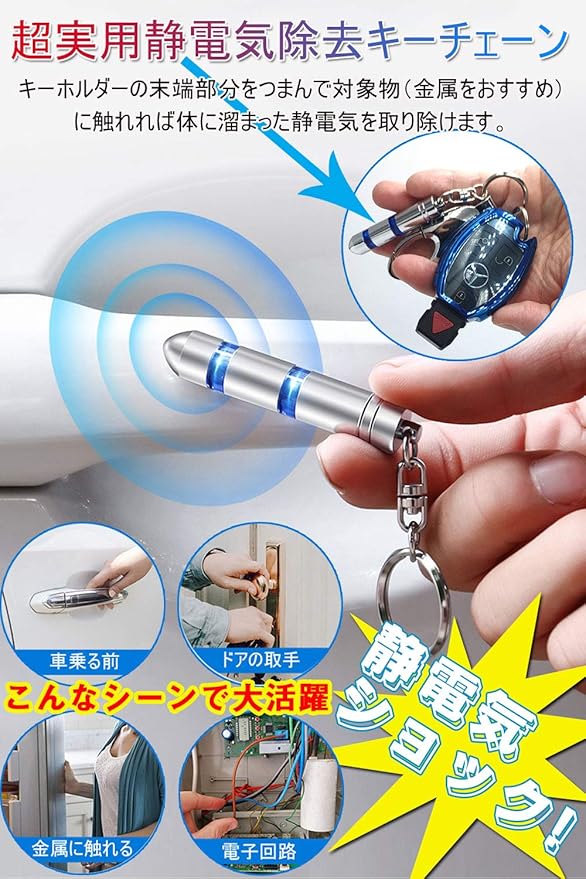 静電気除去キーホルダー: 車体,ドアなどに当てて、嫌な静電気を除去!微光で除電効 果を視認できる、お洒落な静電気除去キーホルダー。合金キーホルダー付きと一緒に使うことで、落下防止効果が得られます。
