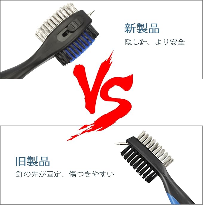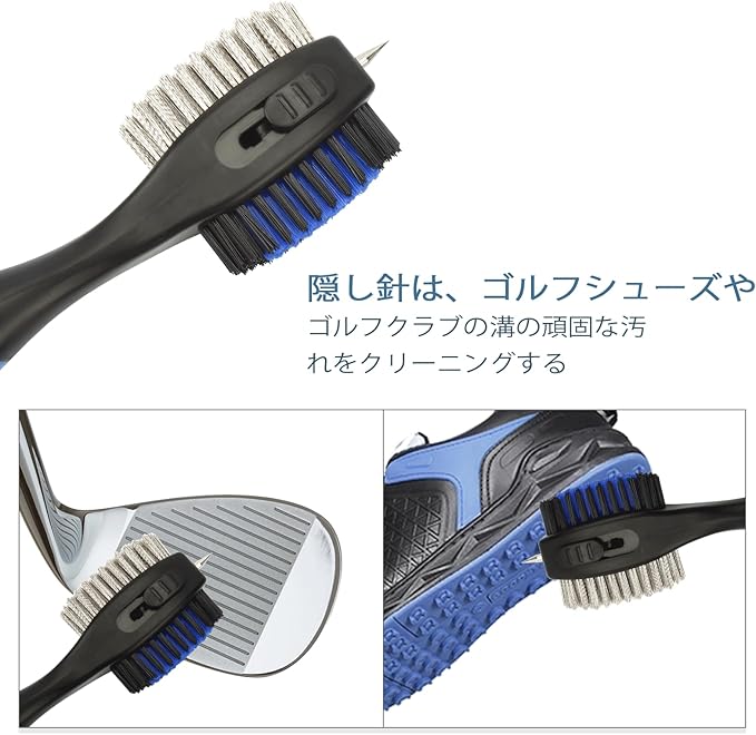 【収納可能な針】ゴルフクラブブラシには収納可能な針が設けられており、使わない時は安全に保管できます。 鋭利な針が溝の頑固な汚れをキレイにし、最高の回転効果と最高の接触効果をもたらします。