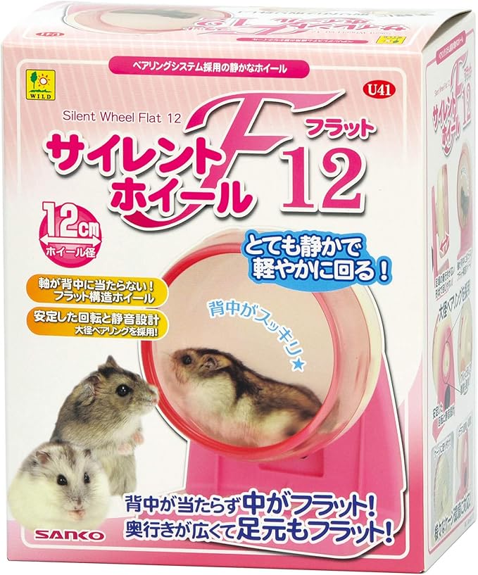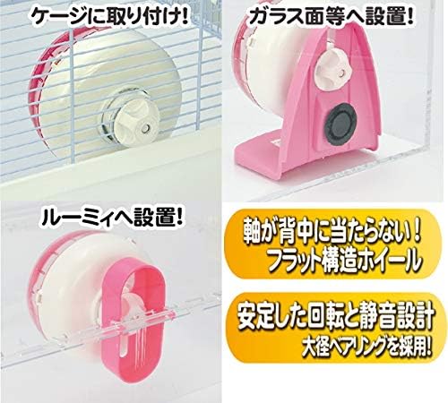 サイレントホイール フラットは、安定した回転の大径ベアリングを採用し、回転時の摩擦音を軽減した小動物用ホイールです。 回転パーツを本体の背面に集約している為、本体の表面がフラットで運動時に背中が当たる事はありません。 そして、回転パーツをひねるだけでホイール本体の着脱が可能で、お手入れも楽々! ホイール径12cm