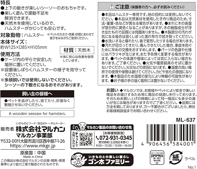 ●上下の動きが楽しいシーソーのおもちゃです。●楽しく遊んで運動不足を解消できます。●天然木を使用しているので、ハムスターがかじっても安心です。