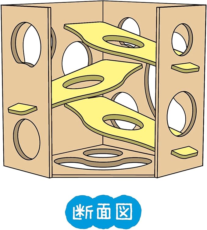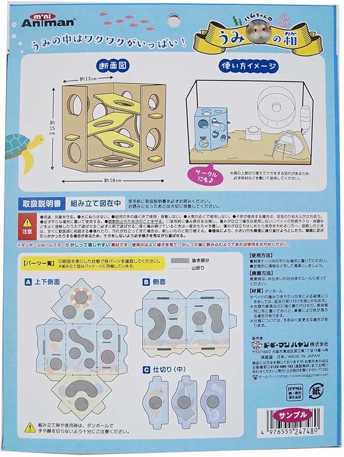 ●かわいいハムちゃんのために組み立ててあげるペーパークラフト感覚のダンボールおもちゃ。●中はラッコ、ジンベエザメ、クラゲの3層のエリアになり、上ったり下りたり楽しめる。●外側にはユニークな窓がいっぱい。どこからでも出入りOK、中もよく見え、中の風景もかわいい。●上って、下りて、遊んで、かじって、かわいいハムちゃんの姿を見て楽めるダンボールのアスレチック玩具。●小型のハムスター用。日本製。