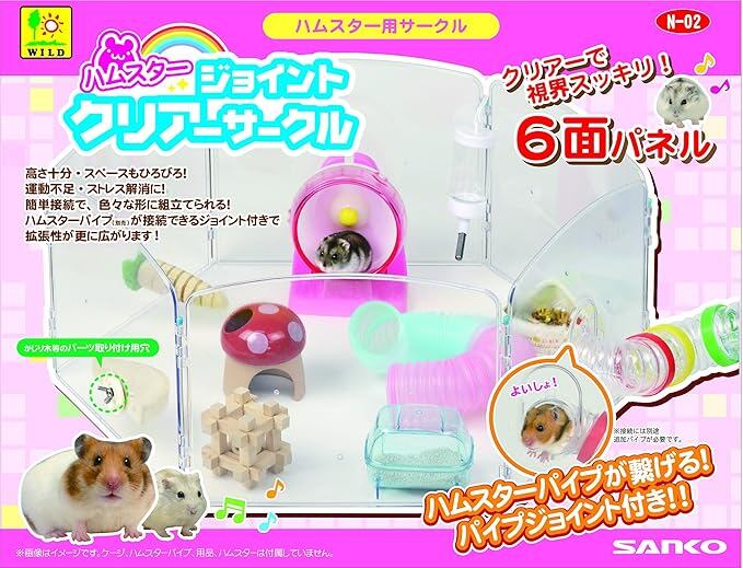 ハムスターがのびのび遊べる自由なサークル! 透明で中が良く見え、運動不足・ストレス解消に最適なサークルです。ハムスターパイプ(別売)が接続できるジョイントが付いているので、拡張性があり、ハムスターの楽しい広場が更に広がります! ジョイントを使用しない場合は、付属のキャップで閉じておくことが出来ます。(付属品:ジョイント用キャップ(1個)/接続棒(6本))