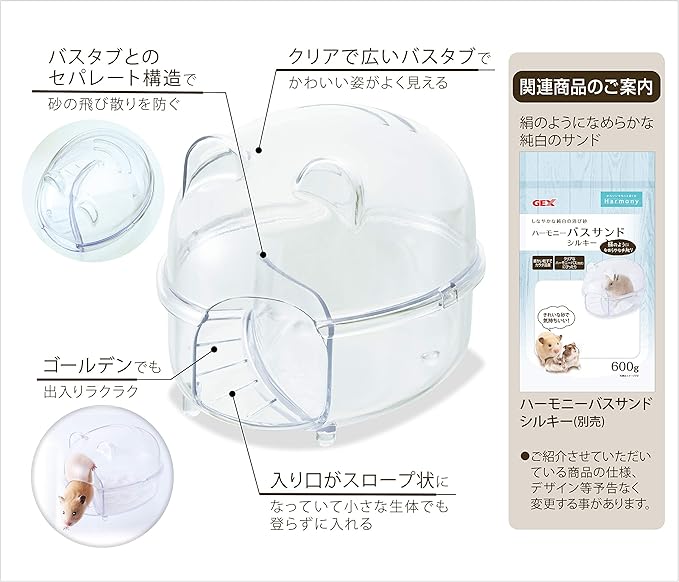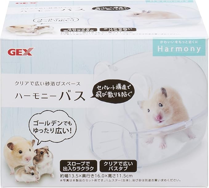 クリアで広い砂浴びスペース!セパレート構造で飛び散りを防ぐ「ハーモニーバス」 ゴールデンでもゆったり広くドワーフでも快適な砂浴びスペース。 ●バスタブとのセパレート構造で砂の飛び散りを防ぐ ●クリアで広いバスタブでかわいい姿がよく見える ●ゴールデンでも出入りラクラクな入口 ●入り口がスロープ状になっていて小さな生体でも登らずに入れる ●グラスハーモニーにもマッチするクリアでかわいい砂浴び用バスです。 <ご使用方法>●;トレーから上部クリアカバーを外し、ハムスター用バスサンド(別売)を1cmの高さを目途に入れてください。●汚れが目立ってきたら、新しいサンドに交換してください。 製品サイズ(組立時):約幅13.5 奥行16.0 高さ11.5cm