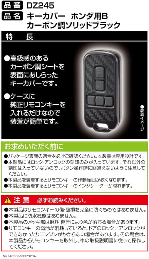●本製品はリモコンキーの傷・破損を完全に防ぐものではありません●本製品に防水機能はありません●本製品のメッキ部は磨耗・傷等により色が落ちる場合があります●リモコンキーの電池が消耗していると、ドアのロック/アンロックができなかったりエンジンがかからない場合があります。その場合は本製品からリモコンキーを取外し、車の取扱説明書に従って操作して下さい