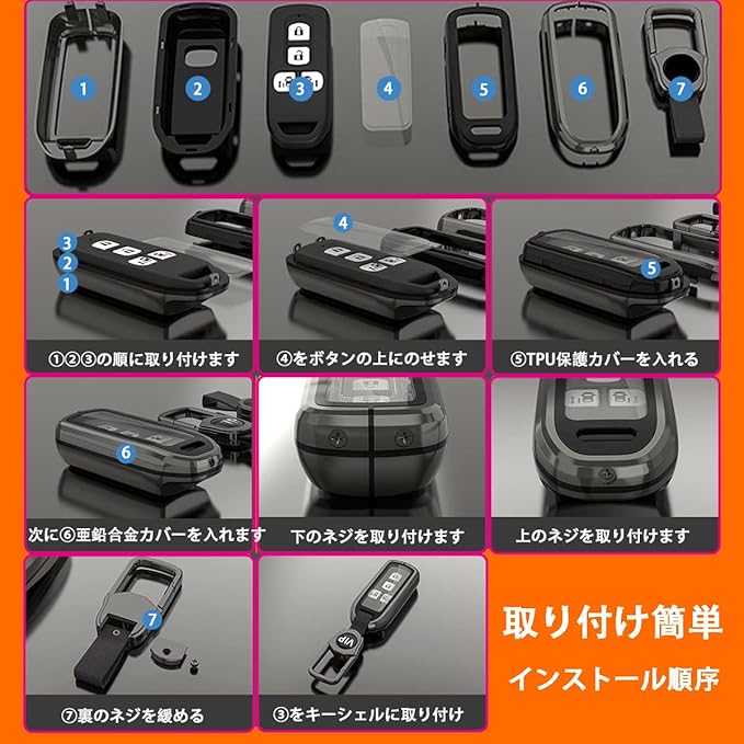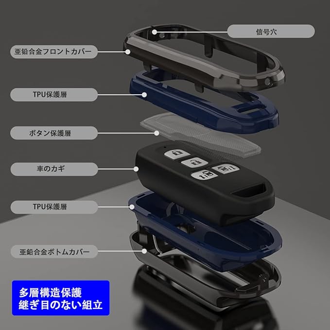【TPU+高質な亜鉛合金材質】N-BOX キーケースには亜鉛合金+TPU素材を採用しており、軽さを確保した上で耐久性も備えています。 亜鉛合表面酸化研磨による耐錆性に優れ、退色や退色を防止します。良質なレザーで豪華さを演出してくれます。本キーケースを取り付けるだけで愛車のスマートキーは高級車のキーに様変わりします。万が一、鍵が落ちた時、キーケースも鍵が壊されないように保護することができて、着地緩衝の効果があります。 車の純正キーを保護する。摩損、キズ、汚れ、滑りなどを防止する。