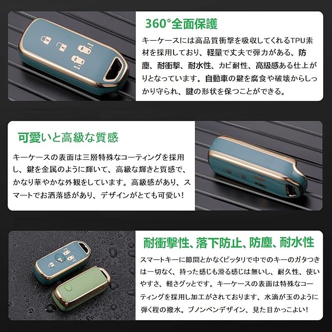 【360 全面保護】キーケースには高品質衝撃を吸収してくれるTPU素材を採用しており、軽量で丈夫で弾力がある、防塵、耐衝撃、耐水性、着地緩衝の効果があります。キーケースの表面は特殊なコーティングを採用し加工がされております、水滴が玉のように弾く程の撥水、自動車の鍵を腐食や破壊からしっかり守られ。360 全面保護、するため 落としてもキーに 傷がつくことはありません。
