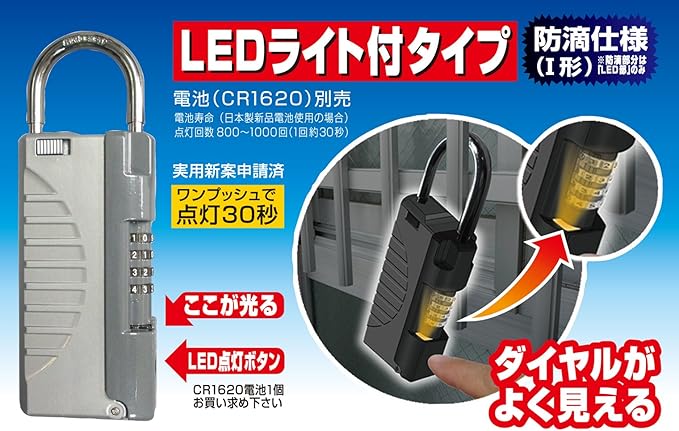 特長:施錠・解錠はダイヤル式でキーは不要。ダイヤル部分がLEDで光るので暗い場所でもダイヤルが確認しやすい。