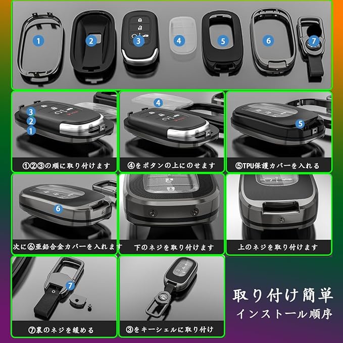 【上質な材料】:ホンダ スマートキーケースには亜鉛合金+TPUで構成されており、亜鉛合金の表面を研磨し、より滑らかな感触になります。 車のキーを完全に保護するキーカバーで保護されています。長期間の使用によるキーの損傷や色あせを防ぐために、快適で完全に包まれているように感じます。自動車の鍵を腐食や破壊からしっかり守られ、鍵の形状を保つことができる。 万が一、鍵が落ちた時、キーケースも鍵が壊されないように保護することができて、着地緩衝の効果があります。手触りが非常に柔らかい。さらに高級感が溢れます。素材・造りの良さで多くの皆様に高く評価いただいています。愛車の専用設計でフィット感抜群です。