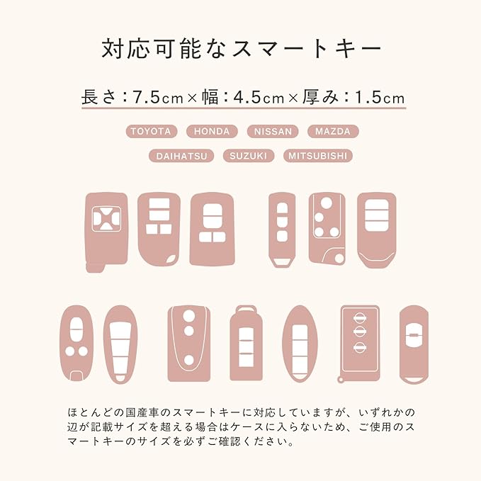 【小さくて軽い。ポケットやバッグにもすっきり収納】 スマートキー1個専用のコンパクト設計で、ポケットや小さめバッグにもスッと収まります。厚みを抑えたスリムな形状ながら、しっかりしたつくりで安心感も◎。軽量なので持ち歩きも快適。普段使いはもちろん、旅行や出張時にも荷物を増やさずに携帯できます。ミニマルで無駄のないフォルムが、スマートな印象を演出します。