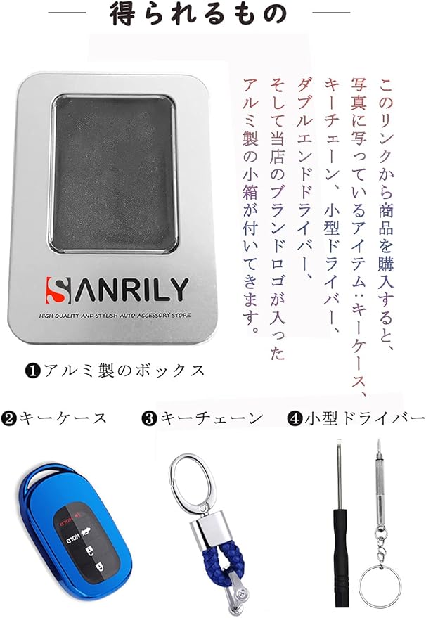 【仕様】キーカバー1個+キーリング1個+SANRILY専用ケース+ミニドライバー付き(スマートキーを含まない)