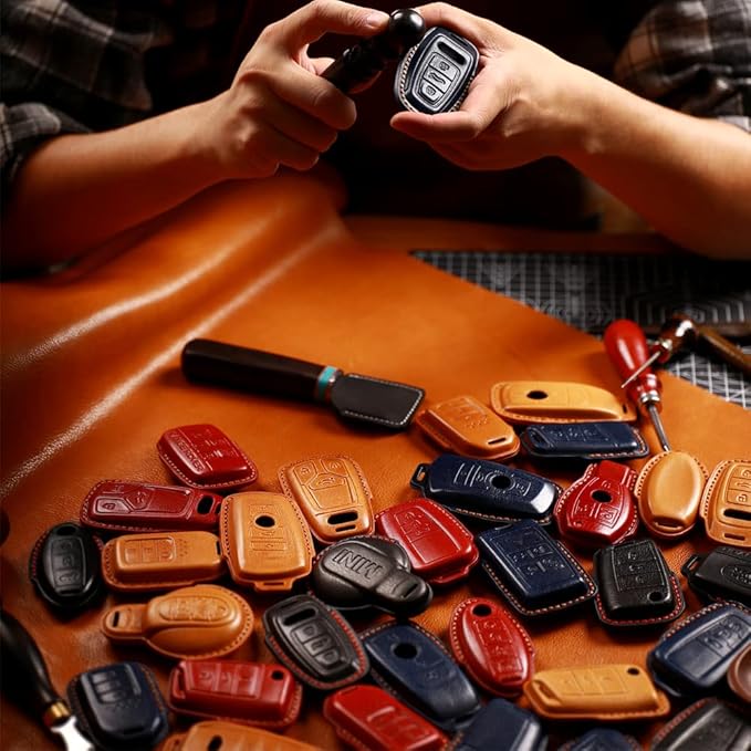 丈夫な牛革を採用するので、落下中の衝撃や傷からスマートキーを保護します。ご愛車のスマートキーを編み込みレザー仕様で手作りの高級感があります。