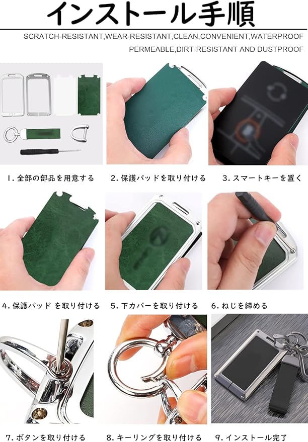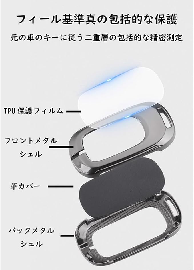 【高品質素材】このキーケースは高品質のアルミ合金と本革素材を採用し、金属の光沢感と皮革の質感を同時に持っています。キーケースをより高級に見せてくれます。また、このキーケースの手触りは快適で、耐圧力性と防塵性があり、自動車のスマートキーとぴったりフィットし、さらに耐久性が優れ、衝撃からキーを守ります
