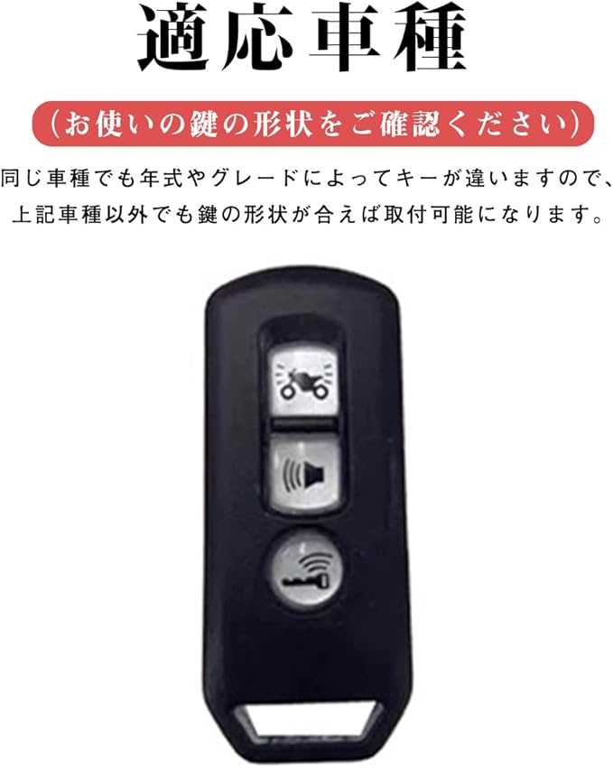 適応車種:HONDA FORZA125・PCX125/150・JF81・XADV750・SH300・スクーピー・スーパーカブC125など。同車種でも年式によりスマートキーの形状が異なる場合がございます。(お使いの鍵の形状をご確認ください)※上記車種以外でも鍵の形状が合えば取り付け可能になります。購入する前に適合キーモデルの画像と一致しているかどうかをご確認してくださいませ。