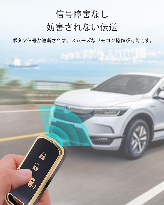 上質なTPU素材で360度保護:ホンダキーケース 選りすぐりのTPU素材を採用し、柔軟性と耐久性を兼ね備えています。全方位からの保護を実現し、キーを汚れ、水、そして衝撃から守ります。長期間使用しても、押しボタンの感触はそのままに、キーを新品のような状態に保ちます。