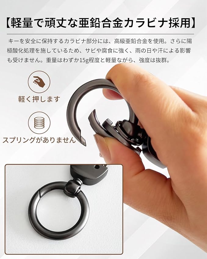 【軽量で頑丈な亜鉛合金カラビナ採用】 キーを安全に保持するカラビナ部分には、高級亜鉛合金を使用。さらに陽極酸化処理を施しているため、サビや腐食に強く、雨の日や汗による影響も受けません。重量はわずか15g程度と軽量ながら、強度は抜群。キーケースをバッグやポケットに入れてもかさばらず、毎日快適に使えます。金属部分のエッジは滑らかに研磨済みなので、手を傷つける心配もありません。アウトドアから日常使いまで、あらゆるシーンで活躍する実用性の高さが特徴です。