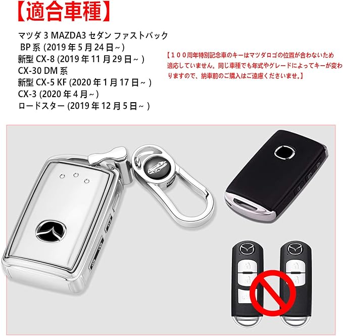 【適用な車型】適合:マツダ 3 mazda3セダン ファストバック BP系 (2019年5月24日~) CX-30 DM系 CX-8 (2019年11月29日~) CX-5 KF (2020年1月17日~) ロードスター (2019年12月5日~) マツダ2 mazda2 Bタイプキー (2019年9月~)(お使いの鍵の形状をご確認ください)【100周年特別記念車のキーはマツダロゴの位置が合わないため、適応していません。】同じ車種でも年式やグレードによってキーが変わりますので、納車前のご購入はご遠慮くださいませ
