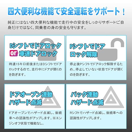 【四大便利な機能】機能1:時速15キ口前後またはDシフトでドアロックするので、走行中にドアが開くのを防ぎます。機能2:停止後Pシフトでドアロック解除するため、停止していない状態でドアが開くのを防ぎます。機能3:ドアオープンでハザード点滅し、後続車への認識性がアップします。※エンジンオフ状態で機能なし。機能4:Rシフトでハザード点滅し、後続車への認識性がアップします。