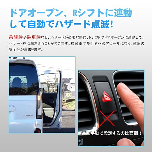 【安全運転をサポ一ト!】乗降時や駐車時など、ハザードが必要な時に、Rシフトやドアオープンに連動して、ハザードを点滅させることができます。後続車や歩行者へのアピールになり、運転の安全性が高まります。