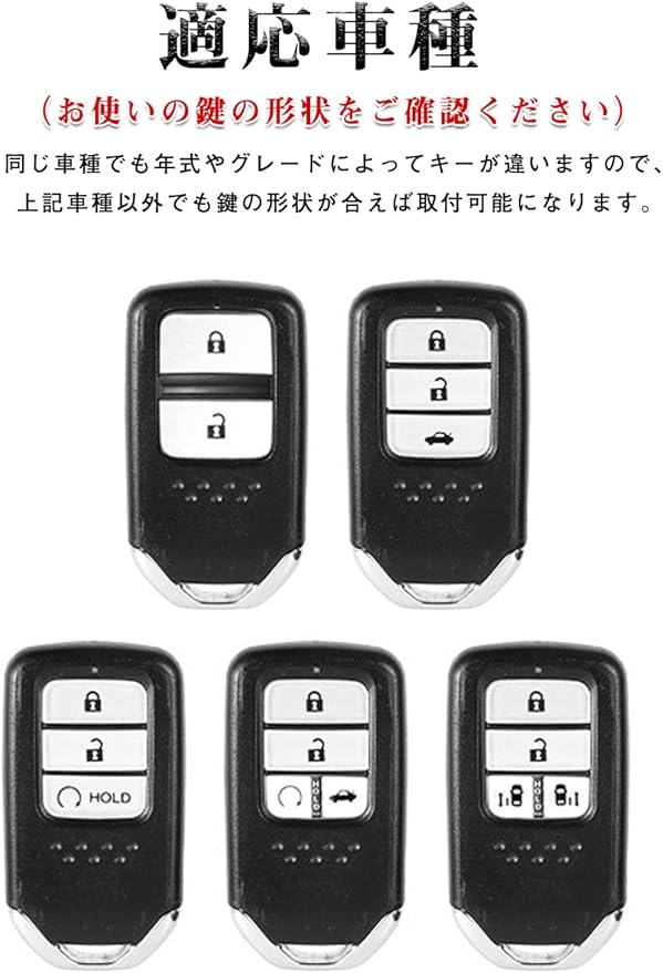 適応車種: HONDA新型フリード フリード+ ハイブリット・ガソリン / 新型オデッセイ ハイブリット・ガソリン 2013.11~/ ステップワゴン スパーダ e:HEV・ガソリン RP1 RP2 RP3 RP4 / 新型フィット 2013.9~ / S660 / CR-Z 2016年~/ ヴェゼル 2014年~ / CR-V ハイブリット・ガソリン 2019年~/ JADE ジェイド / シャトル ハイブリット・ガソリン / シビック セダン / ハッチバック / タイプR 2015年~/ アコード PHEV・ハイブリット / インサイト 2019年~/ グレイス GM4 / GM5 ハイブリット・ガソリン2014年~/ クラリティ FUEL CELL / PHEV。(お使いの鍵の形状をご確認ください)※上記車種以外でも鍵の形状が合えば取り付け可能になります。