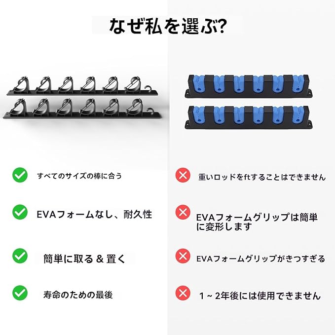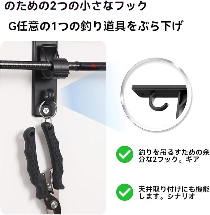 サイズ設計: 一般的な釣竿に対応する汎用性の高いホルダーサイズで、ガレージや物置に最適