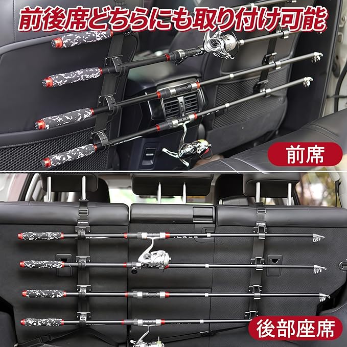 【最新改良版】当社の車用ロッドホルダーは、従来品との最大の違いとして、車の前後または後席に簡単に設置できます。天井に取り付ける必要が一切なく、釣り好きの方にとって、車内空間の有効活用ができます。この独自設計により、最大4本の釣り竿やコンボロッドを車内でしっかり固定でき、どんなに悪路を走行しても全くぐらつきません。