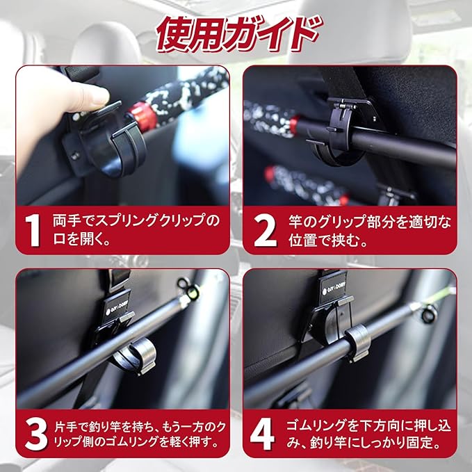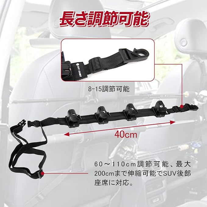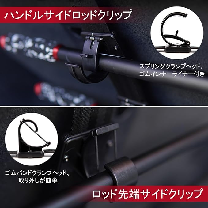 【高品質素材】この商品の最大の特徴は、自動車シートベルトと同素材の高強度伸縮ストラップ2本と8個の特殊クランプを採用していることです。この独自構造により、従来の硬質ホルダーでは難しかった、様々な太さや形状のロッドを、車内で安全かつスペース効率よく収納できるようになりました。