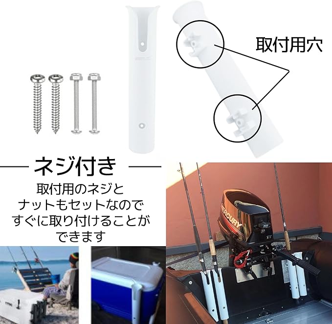 【取り出しがスムーズに】船、ボート、カヤック、カヌーフィッシング、クーラーボックス、キャリーカートなどに取り付け可能なロッドホルダー。 3連構造で、複数のロッドを管理でき、取り出しがスムーズで効率的。 【様々なリールに対応】スピニングリール、電動リールやベイトリールでもしっかりホールドするようにV型の切り欠き部をデザイン。 【収納穴でより便利に】 ロッドだけでなく、ルアー、フック、工具など、様々な釣り道具を収納できる多機能なロッドスタンド。 【簡単取り付け】 取付用のネジとナットがセットになっており、簡単に取り付け可能。 【仕様】素材:プラスチック、カラー:ホワイト/ブラック 【安心の30日間保証】商品品質には万全を機しておりますが、万が一初期不良等発生した場合はご購入から30日間に限り全額返金いたします。 【East Leafオリジナル】East Leafオリジナル梱包にてAmazon倉庫から迅速にお届けいたします。
