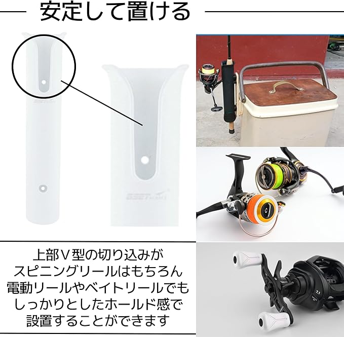 【様々なリールに対応】スピニングリール、電動リールやベイトリールでもしっかりホールドするようにV型の切り欠き部をデザイン。